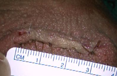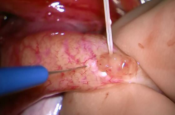The 2-3cm scrotal incision is closed with absorbable sutures.